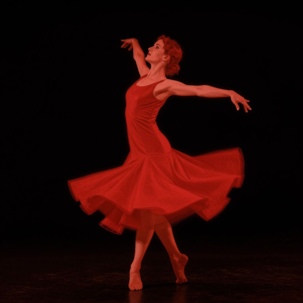 Red illustration a of woman in dress dancing on a black background, patrick westwood style, red series style, artstation trending, high detail, soft light, black background