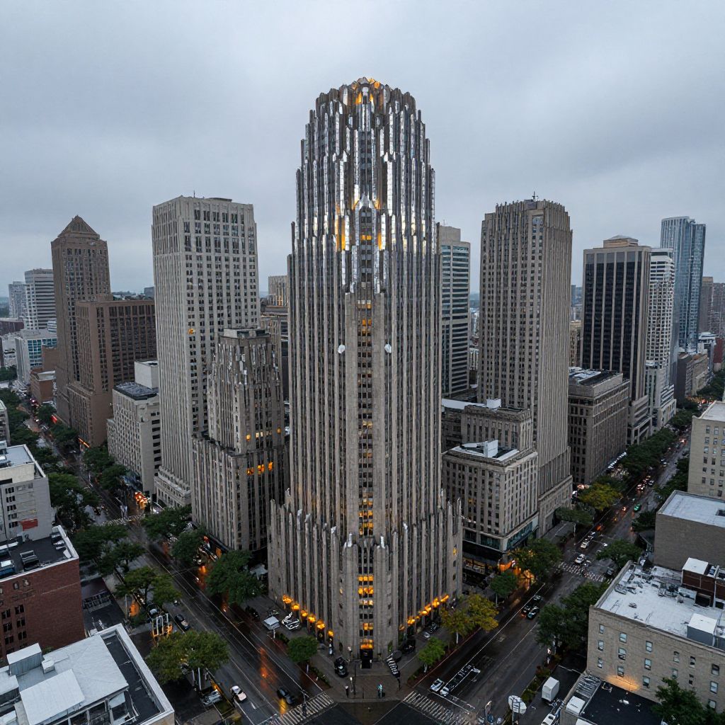 Aerial view of Gotham City art deco district, featuring elegant skyscrapers with zigzag patterns and chrome details, wide avenues lined with symmetrical trees, glowing amber lights reflecting off wet pavements, a blend of modern and classic 20th century architecture
