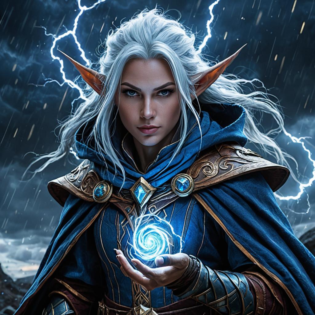 Hyperrealistic portrait of an enchanting storm mage with long white hair and pointed elf-like ears. The character wears an intricate blue and gold mage robe with armored shoulder pads, holding a glowing magical swirling orb emitting lightning. The background features a dark stormy sky with lightning bolts and rain, creating a dramatic and dynamic fantasy atmosphere.