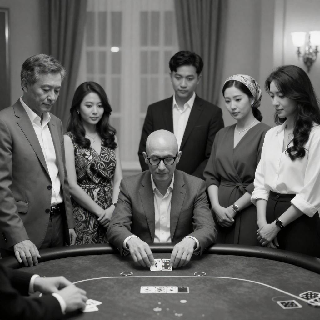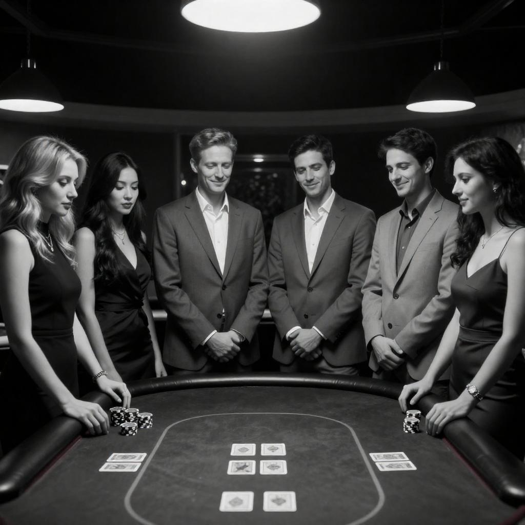 Black-and-white photograph of six people, three men and three women, standing around a poker table in a dimly lit room. They are dressed in formal attire, with the men in suits and the women in dresses. The men are smiling and engaged, while the women appear focused. The table has poker chips and cards. The background is dark with overhead lights.