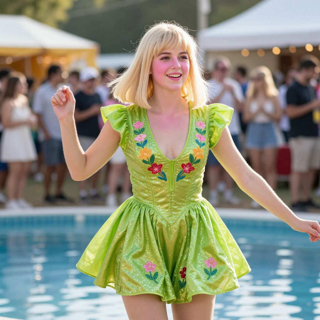 A cheerful party-goer with soft pink cheeks and straight blonde hair wearing a bold lime green costume dress with a plunging neckline and embroidered floral patterns, dancing at a summer festival with a crowd in the background, the dress shimmering under sunlight reflected off a nearby pool