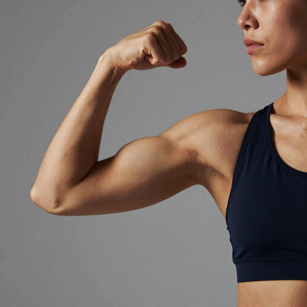 Double bicep flex close-up shot emphasizing muscle texture and skin tone, fitness model in sleek sportswear, soft studio lighting with subtle color gradients