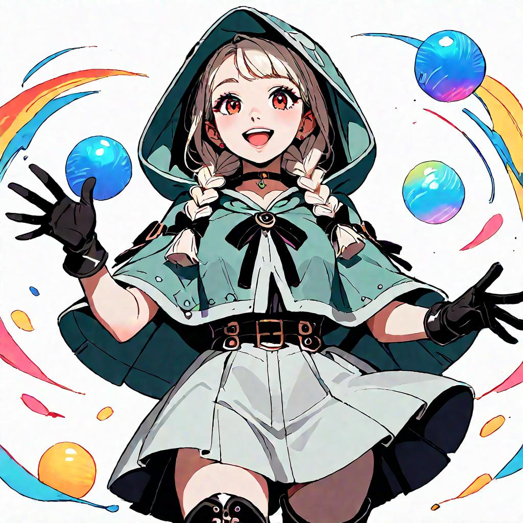 Digital anime-style illustration of a happy young girl with twin blonde braids wearing a green hooded capelet, black leather gloves, a skirt, thigh-high boots, and a choker. She is surrounded by colorful magical orbs and swirling streaks of light, looking at the viewer with a joyful expression.