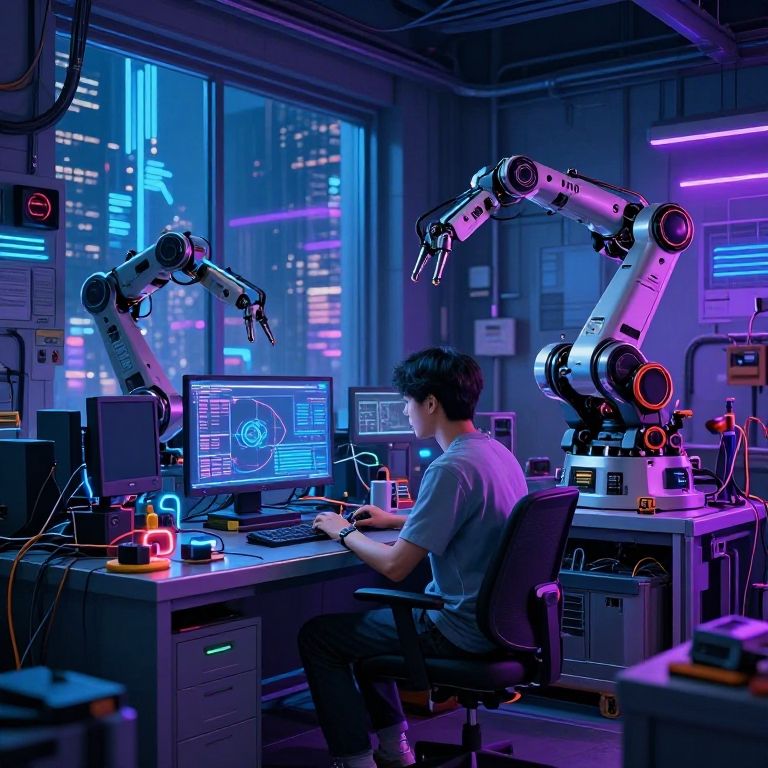 Artist AIgenerated creating a vibrant digital painting in a futuristic studio, surrounded by holographic screens and robotic brushes, showcasing a fusion of technology and creativity, neon blue and purple lighting, highly detailed, cyberpunk art style