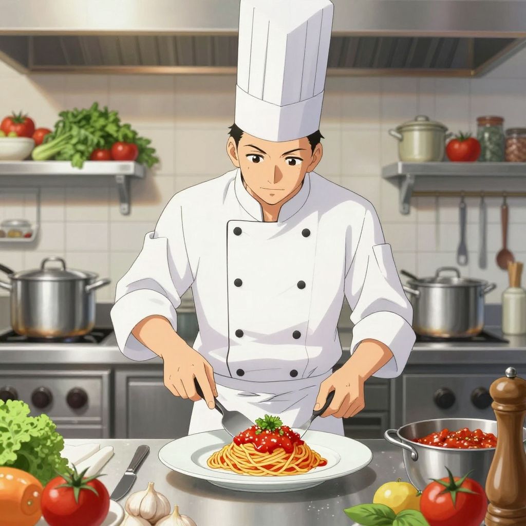 An anime-style skilled chef dressed in a classic white uniform and tall hat prepares a gourmet pasta dish in a busy professional kitchen. The kitchen is filled with fresh ingredients, stainless steel pots, pans, and shelves stocked with vegetables and herbs. The chef, focused and confident, is working with a spatula on a plate of spaghetti with tomato sauce and garnishes.