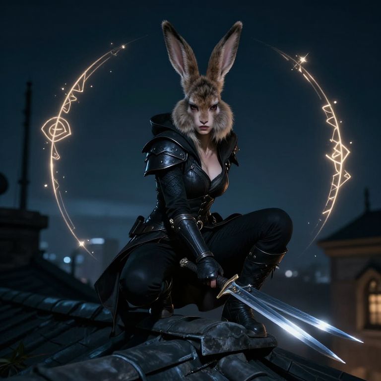 D&d female rabbitfolk rogue, perched on a rooftop at night, sleek dark clothing with subtle armor, dual daggers gleaming, agile pose, surrounded by glowing magical runes, highly detailed fur texture, atmospheric fantasy environment, cinematic mood