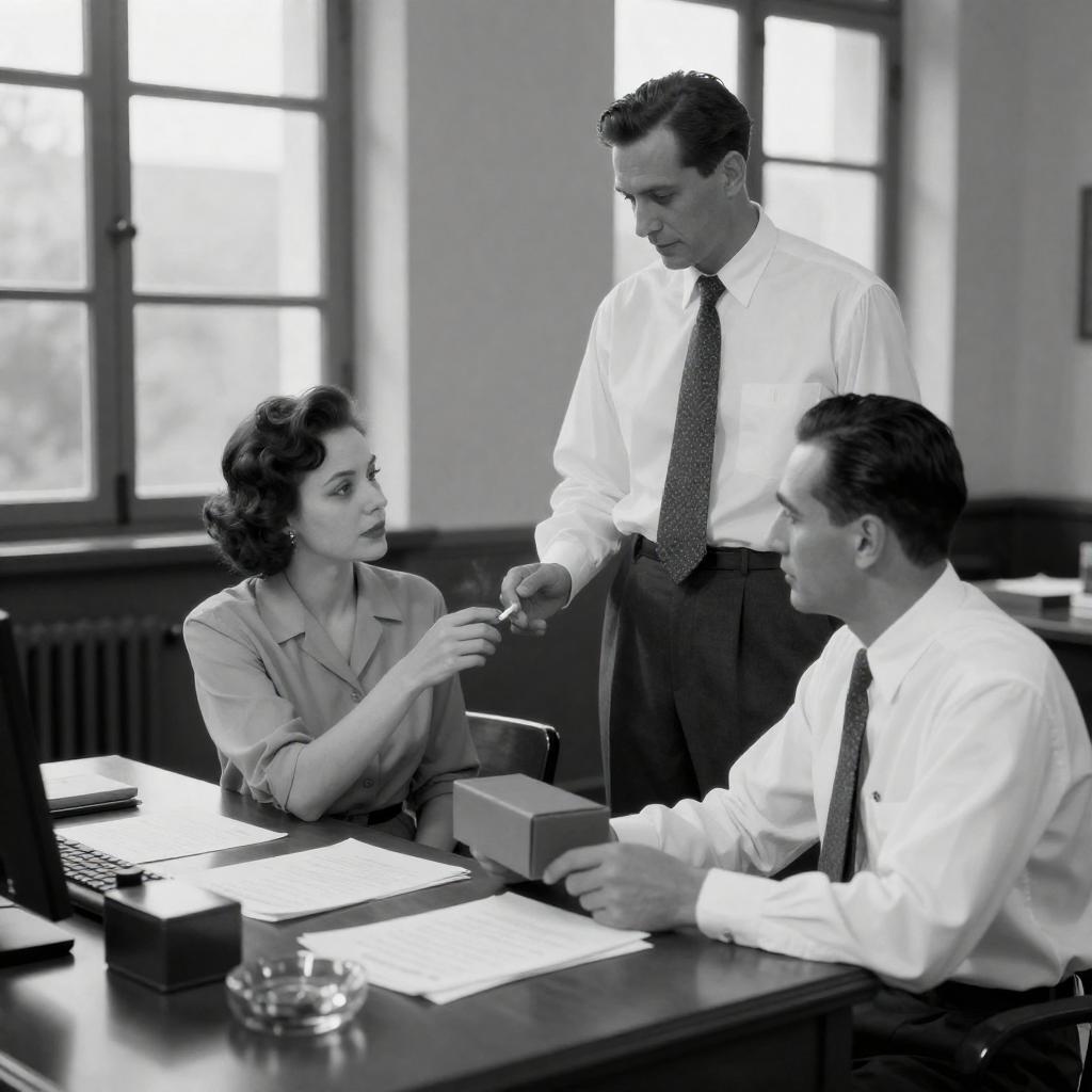 Black-and-white photograph of a man in a suit standing beside a vintage truck loaded with hay, in front of rustic thatched-roof buildings. The man, with short hair and a serious expression, looks at the truck. The truck's wheels and hay are prominently detailed, contrasting with the ured, shadowed background.