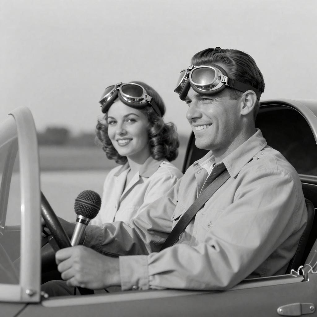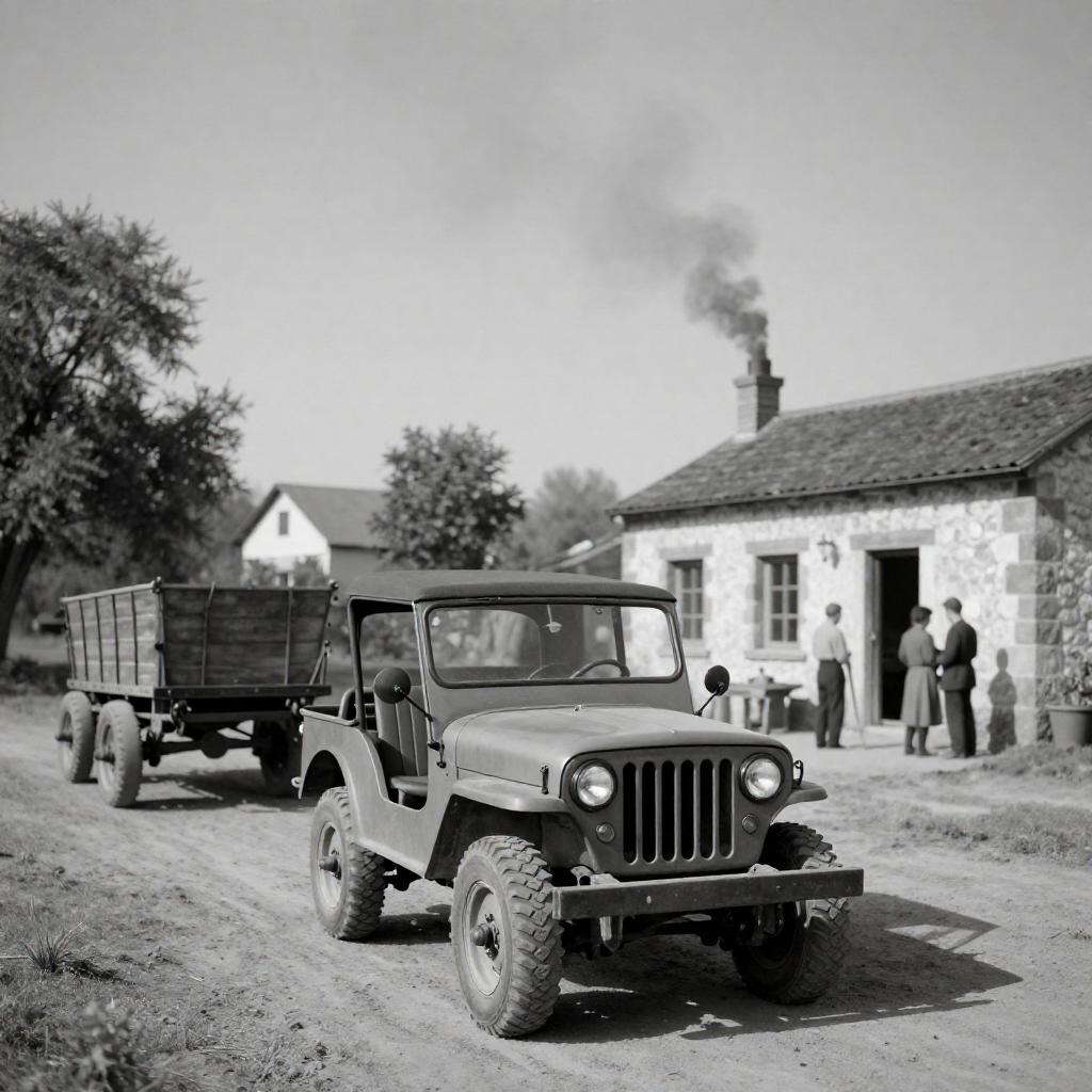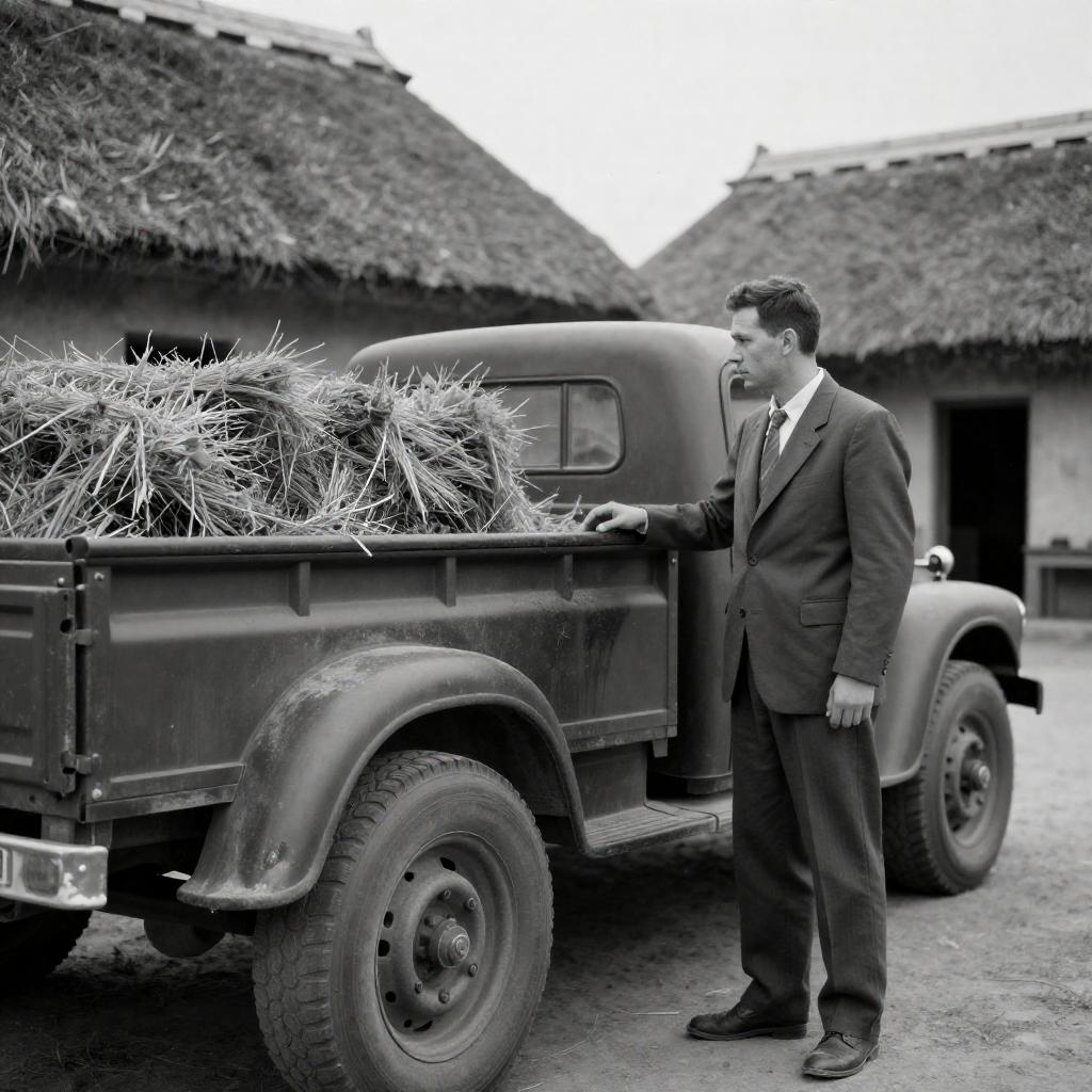 Black-and-white photograph of a man in a suit with short hair standing beside a vintage pickup truck loaded with hay. The scene is set outdoors in front of rustic thatched-roof buildings, with detailed focus on the truck's wheels and the hay in the truck bed. The man looks at the truck with a serious expression.
