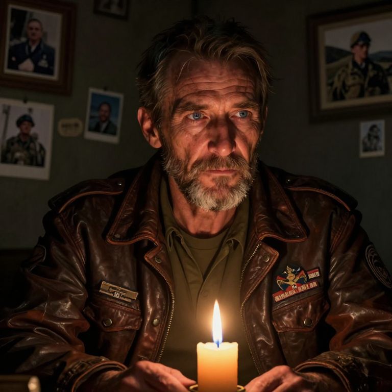 In this hyper-realistic digital artwork, a seasoned veteran, his face illuminated by the warm glow of a candle, sits pensively in a dimly lit room. The veteran, with tranquil blue eyes and salt-and-pepper stubble, gazes into the flickering flame, lost in thought. His worn leather jacket, adorned with military patches, speaks to a life of service, and his gaze carries a mixture of weariness and resilience. Framed photographs and mementos clutter the background, offering glimpses into his past adventures and cherished memories. The low-angle perspective captures the depth and texture of his time-worn features, creating an intimate atmosphere that invites viewers to connect with the story etched upon his face.