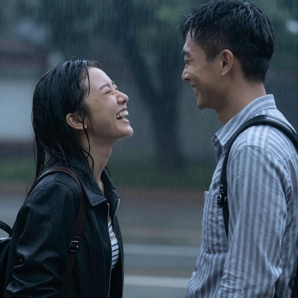 Photograph of an Asian woman and man standing close to each other under heavy rain. Both have wet hair and clothing. The woman, wearing a black jacket over a striped top, is laughing with eyes closed and leaning slightly forward. The man, dressed in a light-colored striped shirt with a backpack, smiles warmly while looking at her. The background is blurred with visible rain streaks, emphasizing the rainy outdoor setting.