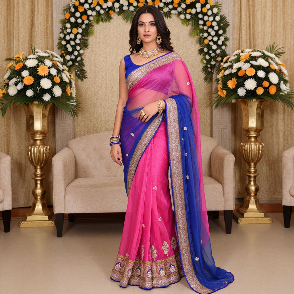 Bollywood Theme Party Dress Woman Costume, a woman in a pink and blue sari standing in front of a floral arrangement
