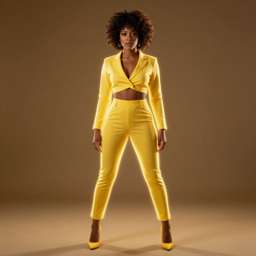 Photograph of a confident Black woman with a dark brown complexion and curly afro hair, standing against a plain beige background. She is wearing a bright yellow, long-sleeve, V-neck blazer with a cutout at the waist, paired with matching yellow high-waisted pants. Her outfit is accentuated by a yellow belt and yellow high heels. The lighting highlights her figure, creating a glowing effect around her silhouette. She stands with legs apart, arms relaxed by her sides, exuding a powerful and poised demeanor. The image has a modern, fashion-focused style.