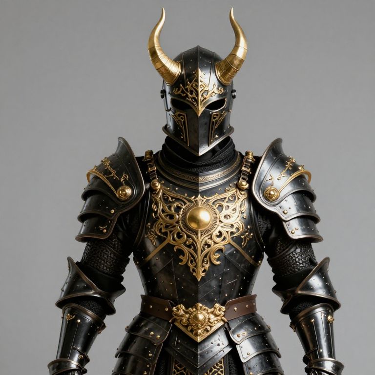 The image depicts a highly detailed and ornate figure clad in intricately designed armor. The armor is predominantly black, with gold accents that highlight its elaborate patterns and textures. The chest piece features a central, ornate emblem with a gold sphere at its core, surrounded by intricate, swirling designs that resemble veins or filigree. The shoulders and arms are adorned with gold-trimmed, segmented plates that add to the armor's imposing and regal appearance. The helmet is a striking feature, with two prominent, curved horns extending from the top, and a faceplate that is also decorated with gold detailing. The overall composition is symmetrical, with the armor's elements arranged in a balanced and harmonious manner, creating a sense of grandeur and power.