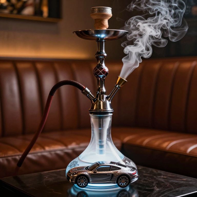 Close-up of a Porsche shisha featuring intricate car-inspired design elements, chrome accents, glowing LED base, luxurious leather seating environment, warm moody lighting and swirling aromatic smoke