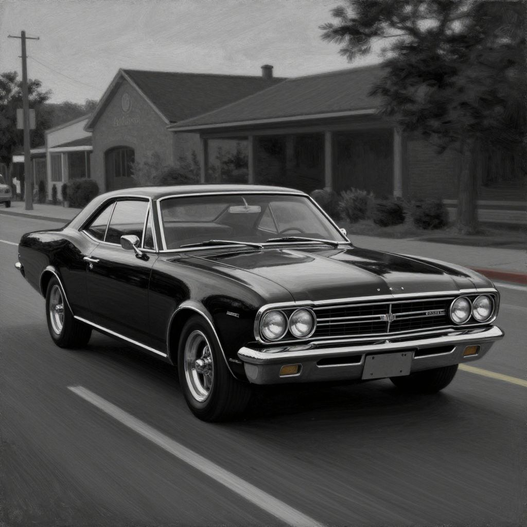 A nostalgically crafted relic of the past, a meticulously restored deep Monochrome pearlescent classic 60's muscle car cruises through the dusk streets with an intimidating elegance, The vintage vehicle gleams with a lustrous sheen, showcasing its aerodynamic lines and sharp accents as it cruises along the asphalt, This evocative scene is captured in a vividly detailed oil painting, where every brushstroke highlights the car's classic styling and pristine condition, Impeccably rendered, this image transports viewers to a bygone era of automotive luxury and style, secretlab