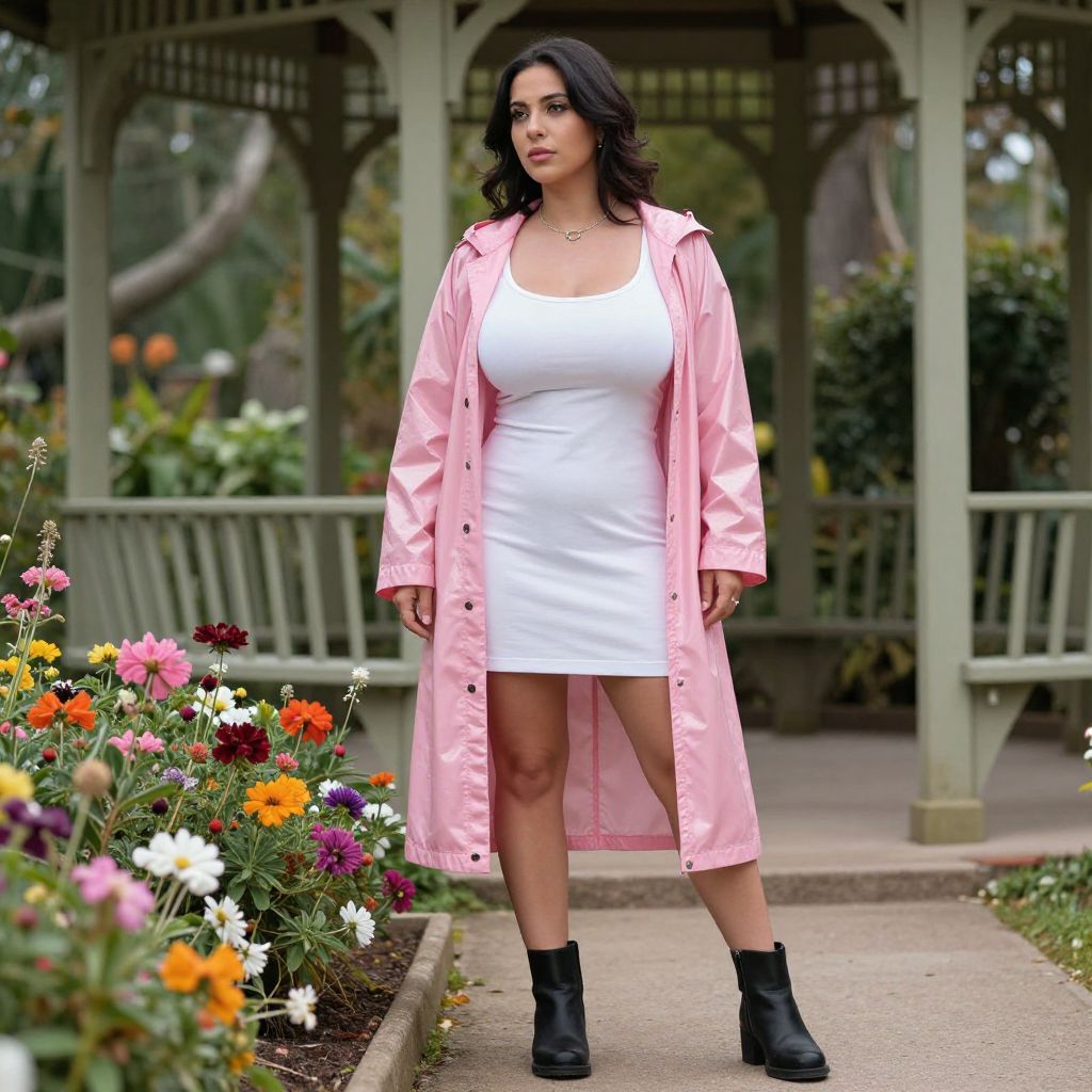 A woman in a glossy pink raincoat layered over a simple white dress, paired with black ankle boots, stands under a gazebo in a botanical garden, admiring the vibrant flowers around her. Visual style: Juan Francisco Casas Ruiz. Sexy. Pretty face and beаutiful eyes. Big breasts