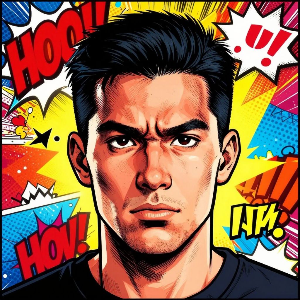 Portrait transformed by comic book photo filter, emphasizing intense facial expressions, thick ink outlines, bright primary colors, stylized shading with crosshatch patterns, background filled with explosive comic-style action words and bursts, energetic and vivid.