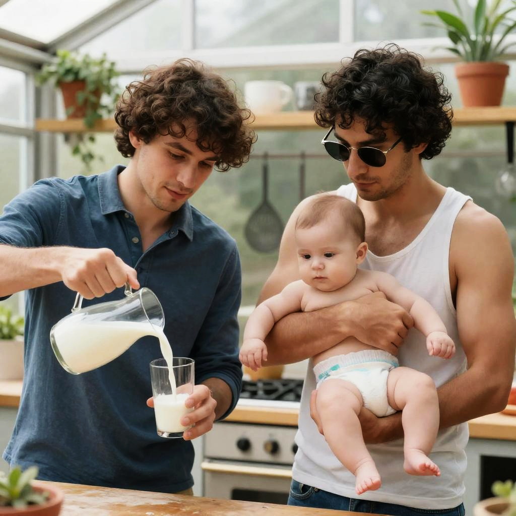 Photograph of two men and a baby. The man on the left, with curly dark hair and a blue shirt, pours milk from a glass into a bottle held by the man on the right, who has dark curly hair, a mustache, and a gray tank top. The baby, with a bald head, wears a light blue hat and white diaper. The man on the right holds the baby in his left arm. Bright, sunlit background with blurred plants.