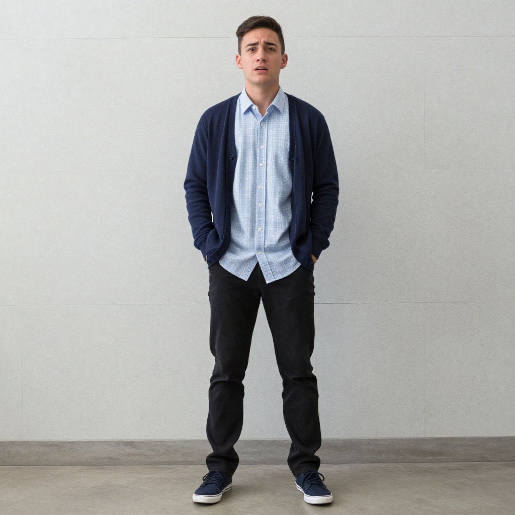 Photograph of a young man with short black hair, wearing a blue plaid jacket, white shirt, black pants, and white sneakers, standing against