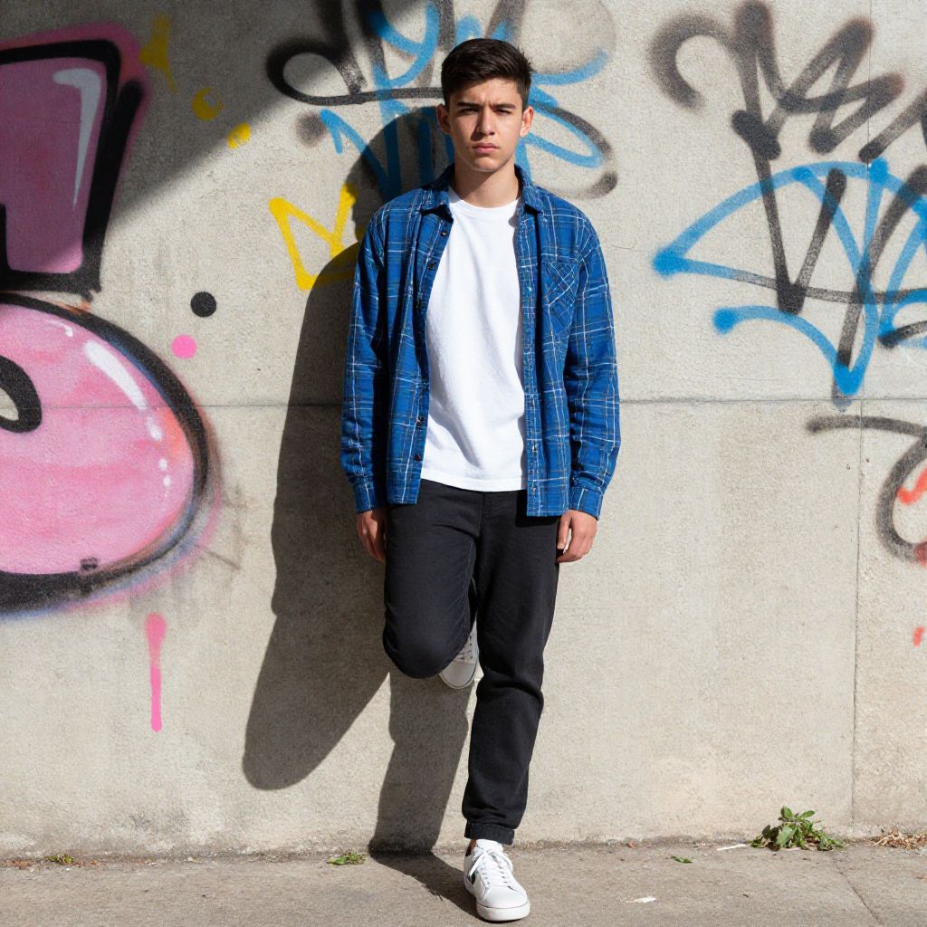 Photograph of a young man standing against a graffiti-covered concrete wall. He has short, dark hair and a serious expression. He's wearing a blue plaid shirt over a white t-shirt, black pants, and white sneakers. His left leg is bent at the knee, foot resting against the wall. The graffiti includes colorful letters and tags in pink, blue, and yellow. Bright sunlight casts a sharp shadow behind him.