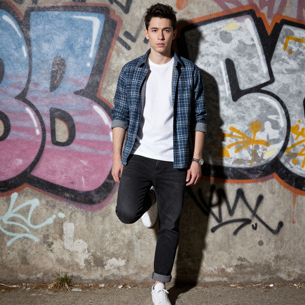 Photograph of a young, light-skinned man with short, dark hair standing against a concrete wall covered in colorful graffiti. He wears a blue and black plaid shirt over a plain white t-shirt, black pants, and white sneakers. His right leg is bent at the knee, foot resting on the ground, while his left leg is straight. The bright sunlight casts a shadow of him on the wall. The graffiti includes pink, blue, yellow, and black tags and shapes, adding urban contrast to his casual, modern attire.
