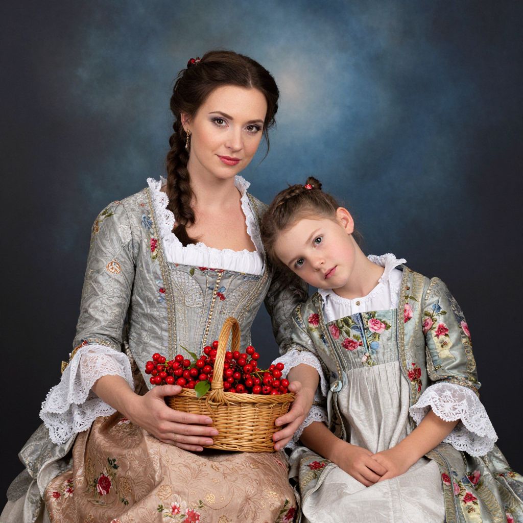 Elegant mother and child sit together against a celestial backdrop, the woman cradling a basket of vibrant red berries while the child rests her head gently on the woman's shoulder, both adorned in intricately detailed period attire featuring floral patterns and lace accents.