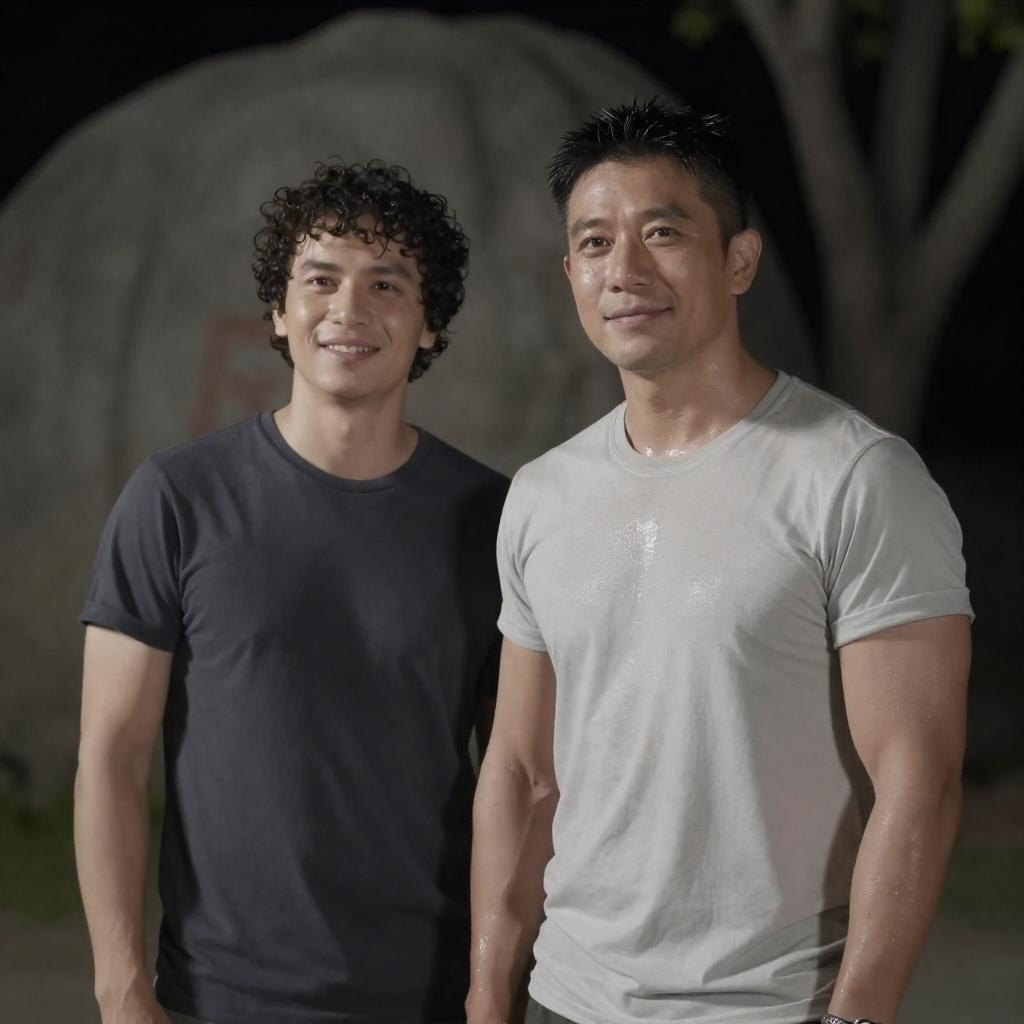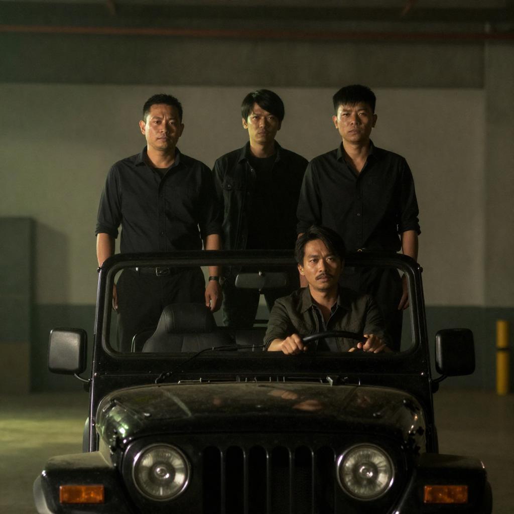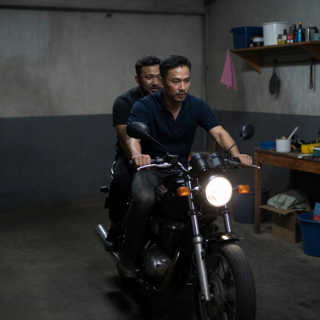 Photograph of two men in dark clothing riding a motorcycle with a bright headlight in a dimly lit, cluttered garage. The man in front is focused on the road, while the man behind leans forward. The garage has worn, gray walls, shelves with tools, and a pink cloth hanging in the background.
