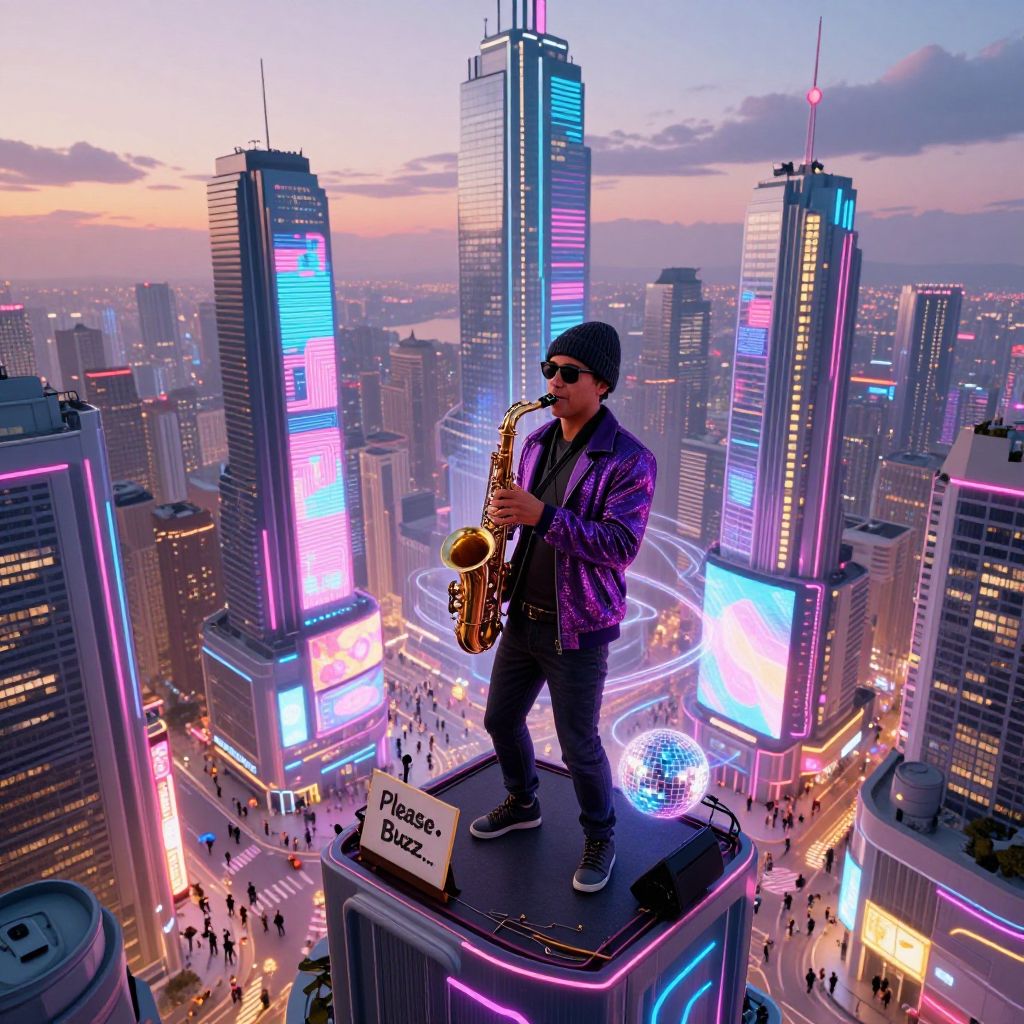 Create an image of a futuristic city at twilight, bathed in neon lights casting vibrant hues of pink, blue, and yellow across the skyline. From a high vantage point, showcase the intricate fusion of towering skyscrapers adorned with holographic billboards and lively streets teeming with various characters. In the heart of this digital metropolis, a street musician clad in a beanie, sunglasses, and a shimmering purple jacket plays the saxophone atop a raised platform. As disco lights swirl around him, he holds a sign reading \"Please Buzz...\", suggesting a blend of hope and yearning amidst the futuristic environment. This image should seamlessly combine hyper-detailed photorealism with stylized digital art, inviting viewers to delve into the intricate mosaic of human emotion in a world where technology and enchantment converge.