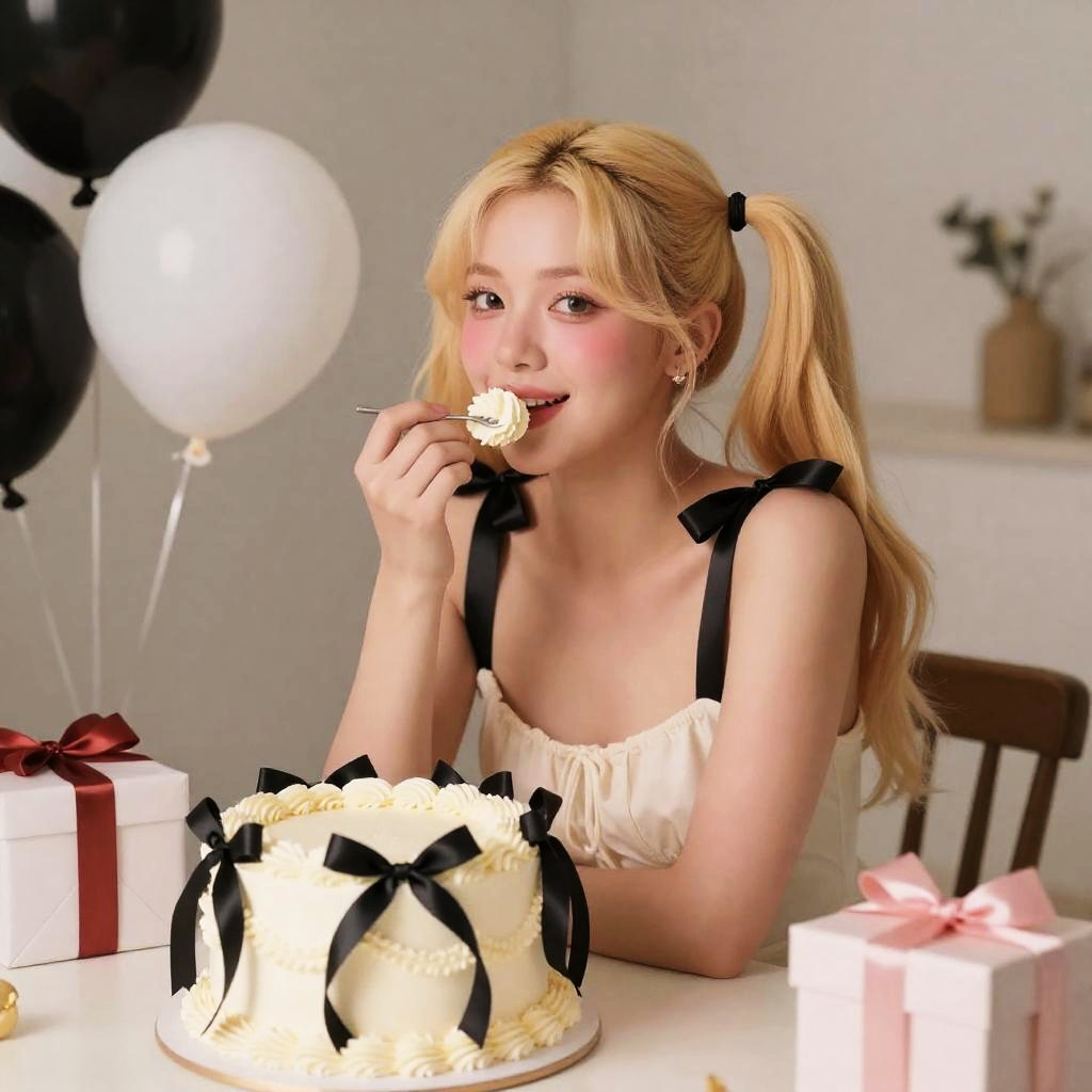 Highres, masterpiece, perfect ligthing, bloom, cinematic lighting, adult, perfect skin, female, (RSEEmma:1.4), twintails, cleavage, sundress, smile, blush, big black ribbons, blonde, eating, cream, big cake, birthday, gifts, (balloons:1.2), table, sit