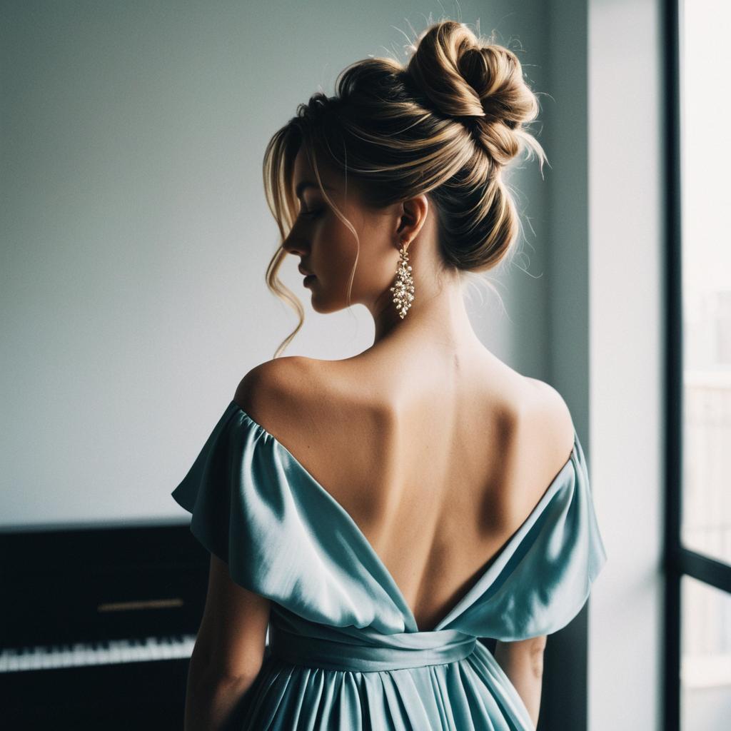 Twisted Updo hairstyle on professional model, wearing sleek satin jumpsuit, in modern art gallery, captured in fashion editorial style with soft ambient light.