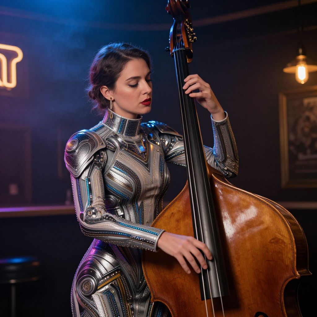 A woman in a futuristic, high-neck dress plays a double bass in a smoky jazz club, her fingers expertly plucking the strings.