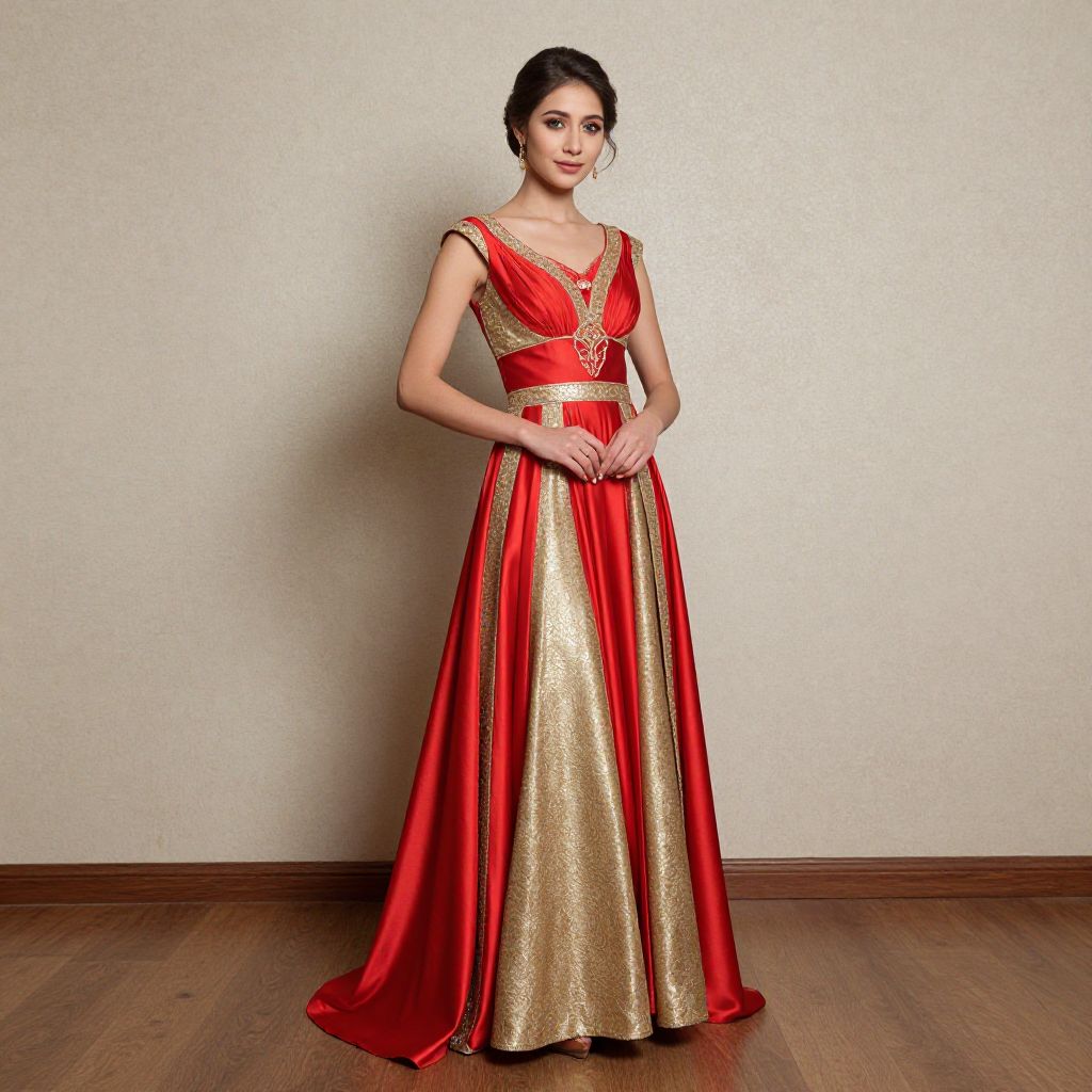 Photograph of a young woman standing against a plain, light beige wall with wooden flooring. She has fair skin, dark brown hair styled in an elegant updo, and is wearing a sleeveless, floor-length gown. The dress features a rich red satin bodice with gold embroidered detailing and a V-neckline, accented by a gold brooch at the center. The skirt is a gold, shimmering fabric with red satin panels. She stands with her hands gently clasped in front of her, exuding grace and confidence. The lighting is even, highlighting the textures and colors of the dress.