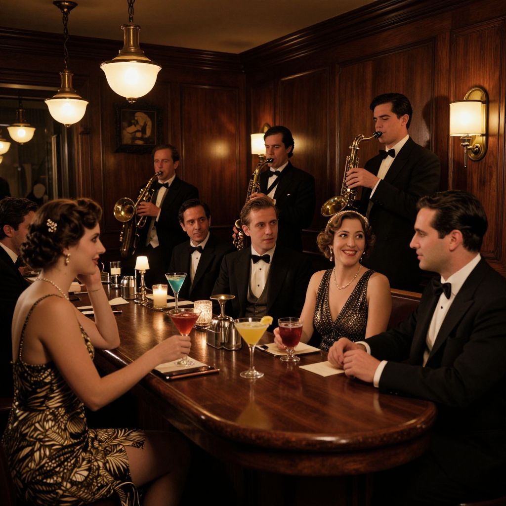 1920's speakeasy interior with elegantly dressed patrons, classic cocktails on the bar, musicians playing saxophone and trumpet, rich wood paneling, dim warm lighting creating a mysterious and lively atmosphere