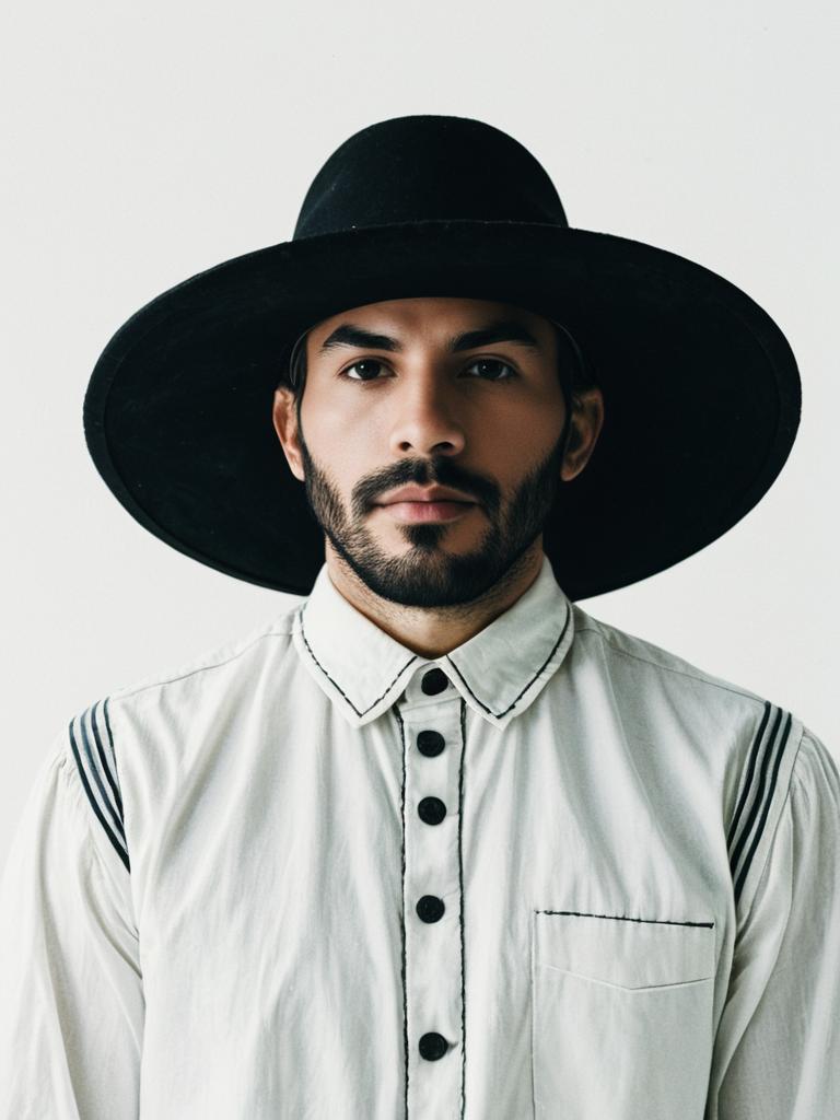 Photograph of a young South Asian man with a medium brown complexion, neatly trimmed beard, and mustache. He wears a large, black, wide-brimmed hat and a white, long-sleeved button-up shirt with black stripes on the shoulders. His shirt has a chest pocket and black buttons. He gazes directly at the camera with a neutral expression. The background is a simple, clean white, with gray borders on the left and right sides of the image. The lighting is even, highlighting his face and shirt. His overall appearance is stylish and modern.