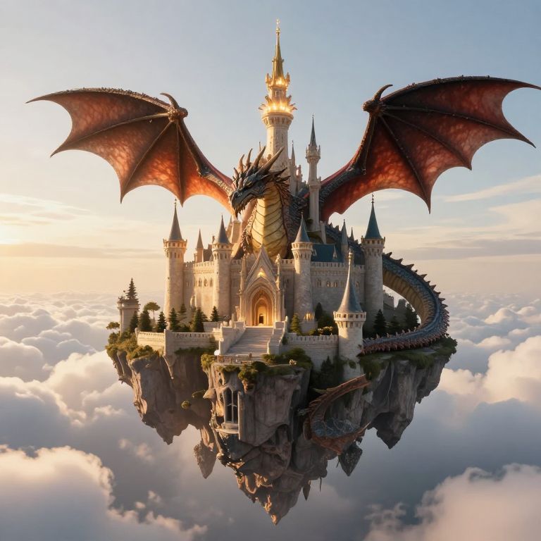 A majestic, golden castle perched atop a serene island floats improbably above the ocean, its grandeur mirrored by the gentle presence of a colossal blue whale gliding beneath the waves, creating a surreal harmony between land and sea.