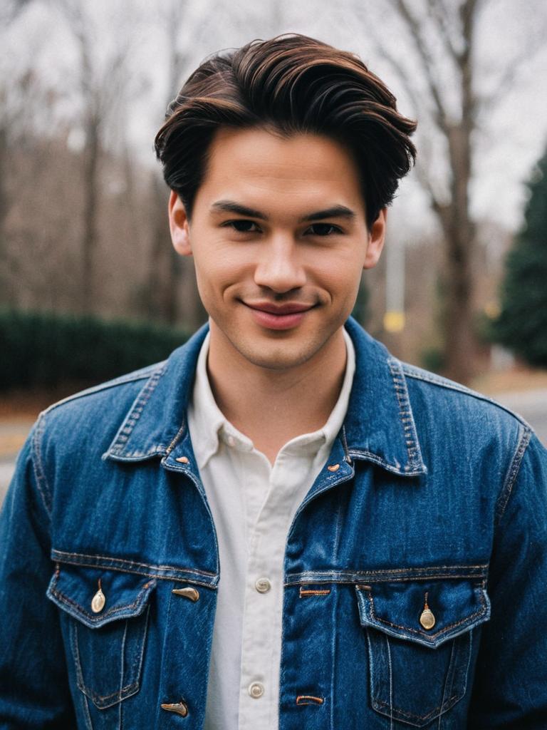 Riverdale jughead jones, 1boy, male focus, solo, denim jacket, blurry background, jacket, shirt, white shirt, blue jacket, brown hair, realistic, blurry, looking at viewer, pocket, upper body, closed mouth, open jacket, denim, outdoors, breast pocket, smile, collared shirt, open clothes, short hair, straight-on