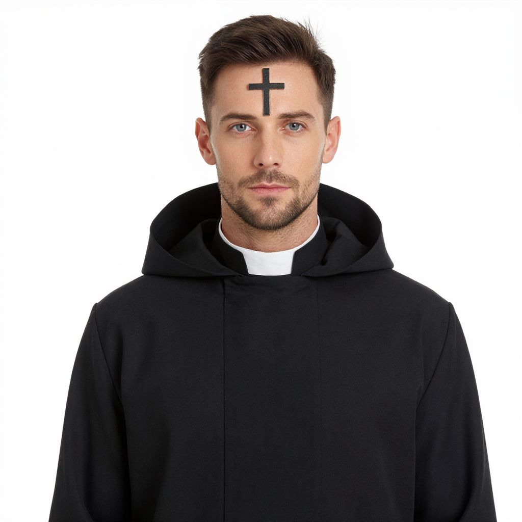 "Vicar Fancy Dress Costume, man in a priest's outfit with a cross on his forehead"