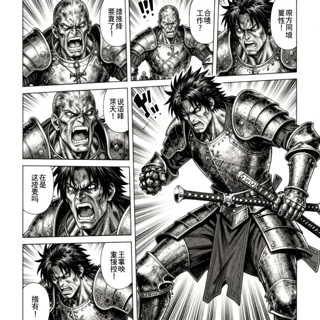 Beserk manga panels full of chaotic battle scenes, powerful and brutal combat choreography, extreme facial expressions, dark and gritty ambiance, detailed medieval armor and weaponry, emphasizing the raw intensity of the story.