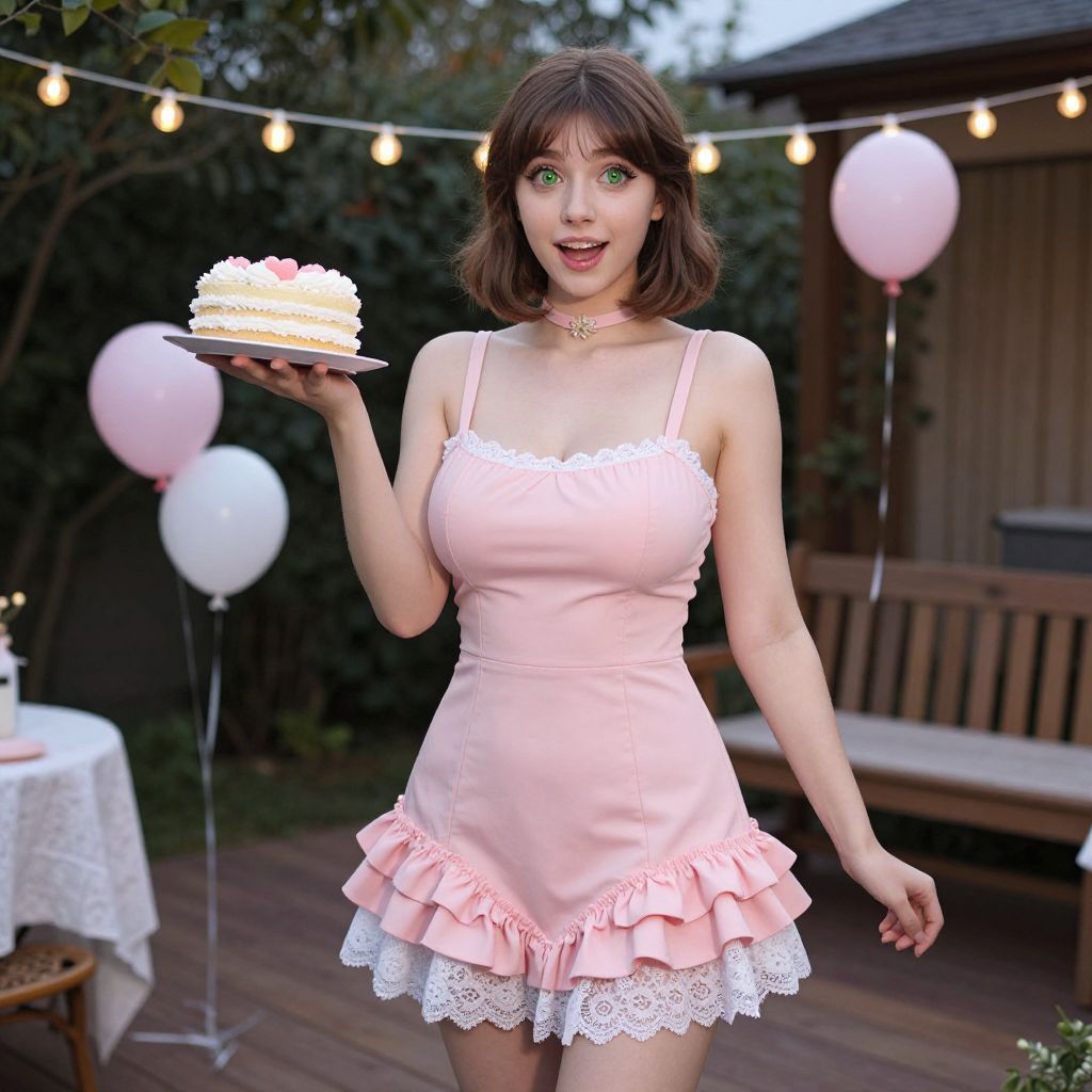 A slim woman with wide, expressive green eyes and a youthful face wears a classic pastel pink mini dress with a dramatic ruffled hem and lace trim as part of a costume for a themed birthday party. The setting is a cozy outdoor backyard with fairy lights, a wooden deck, and a string of balloons. She is posing with a cake in her hand, laughing slightly, adding warmth and a festive charm to the image.. The woman has big tits and cute face