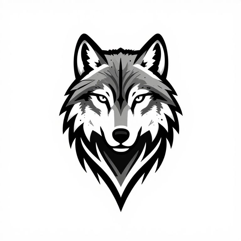 A minimalist, symmetrical wolf tattoo in black and white, featuring intricate vector designs on a white background.