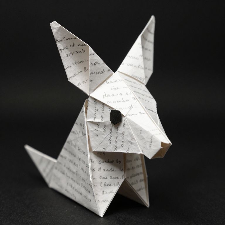 Origami artistry unfolds in intricate detail, transforming paper into a three-dimensional kangaroo head, its geometric facets adorned with handwritten text resembling diary entries against a stark black background.
