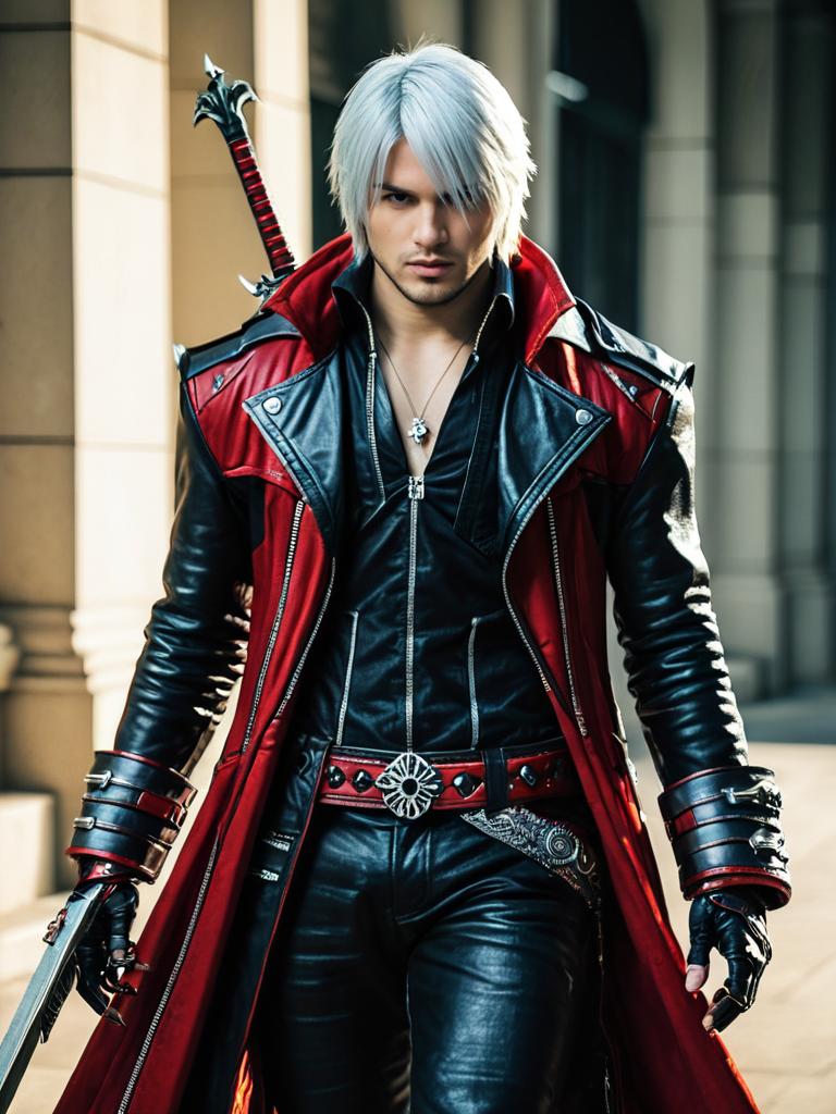 Man cosplay. Wearing Nero (Devil May Cry) costume. Realistic photo. Dressed as Nero (Devil May Cry) --sref 1393