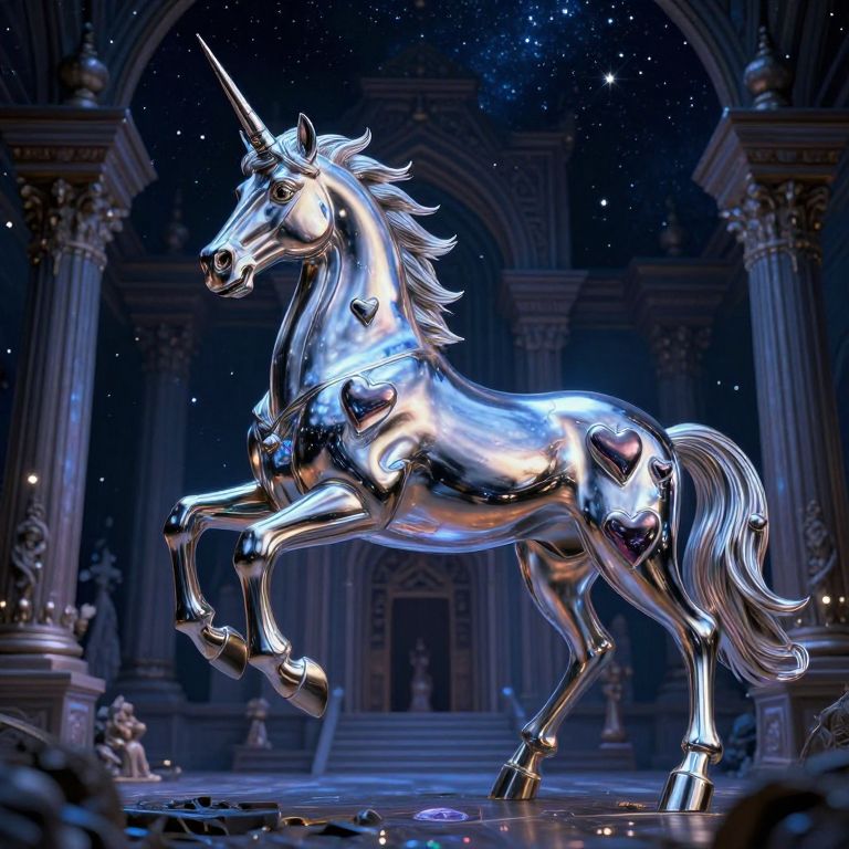 Photorealistic CGI image of a shiny, silver unicorn statue with a reflective, metallic surface. The unicorn has a prominent, spiraled horn, flowing mane, and tail, both adorned with heart-shaped cutouts. It stands in a majestic, grandiose architectural setting with tall, arched columns and a starry night sky backdrop. The statue is centered, with its right front leg raised as if in mid-trot. The background features soft, luminescent blue lighting, highlighting the unicorn's glossy texture and heart motifs. The image has a magical, fantasy-like atmosphere with intricate details and a high level of realism.