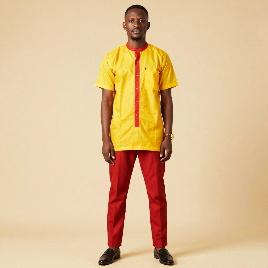 Portrait of a dark-skinned African man wearing a traditional short Owambe style outfit. The attire features a yellow tunic with red accents on the collar, buttons, pocket trim, and red pants. He stands against a plain beige wall.