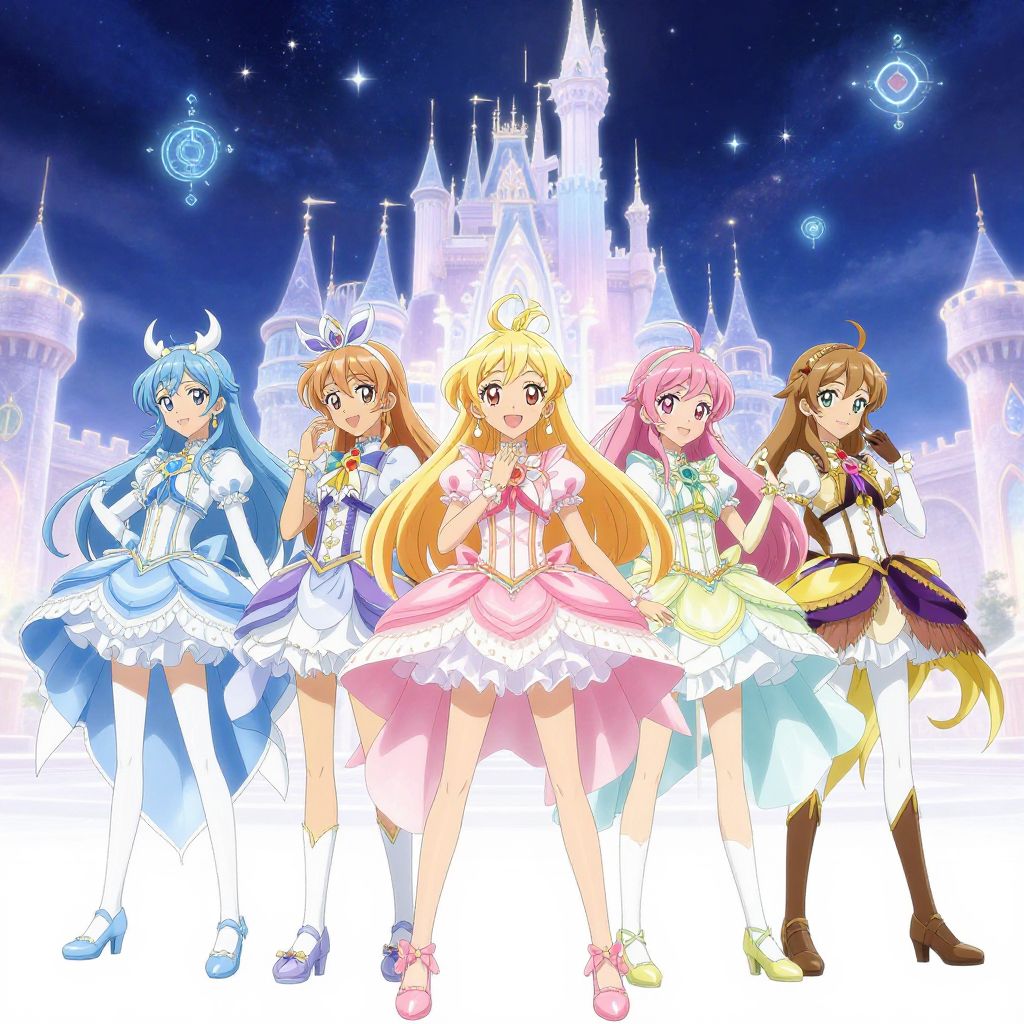Digital anime-style illustration of eleven schoolgirls in navy blue sailor uniforms standing in a line on a reflective stage with a pink and red gradient background.