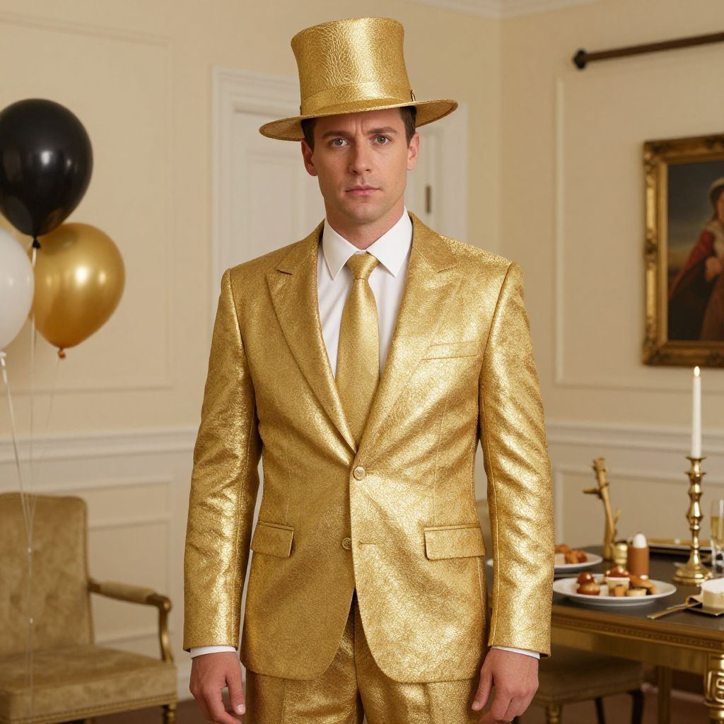 Photograph of a young Caucasian man with fair skin and short brown hair, wearing a shimmering gold suit jacket, gold tie, and gold top hat. He stands in an elegant, cream-colored room with white wainscoting. In the background, there are black, white, and gold balloons on the left and a dining table with a golden candelabra and plates on the right. A framed painting hangs on the wall. The man's expression is neutral, and he is centered in the frame. The overall scene has a luxurious, festive vibe.