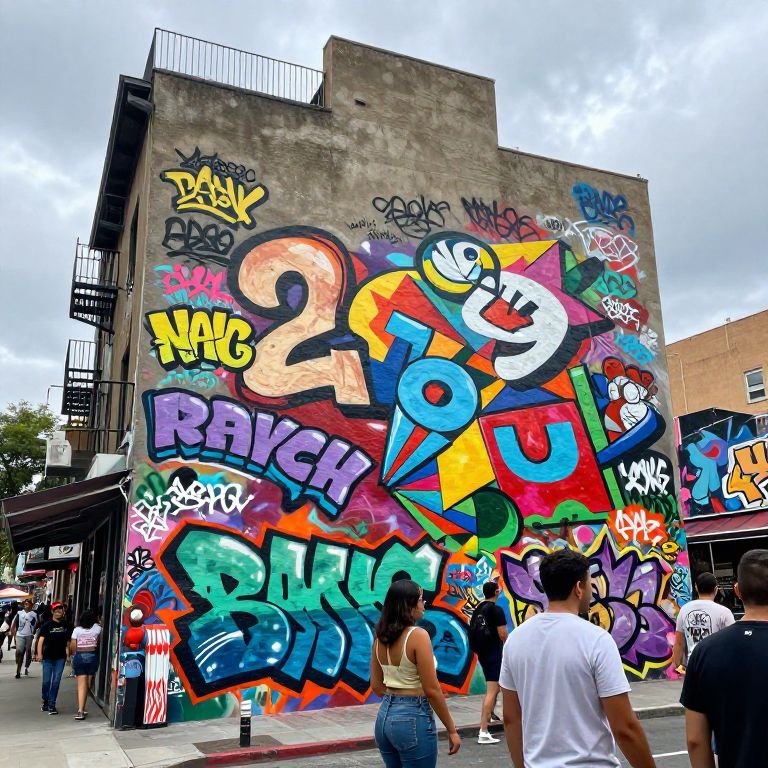 Urban muro covered in colorful street art and murals, lively city environment, diverse crowd nearby, dynamic composition with bold graffiti styles and bright contrasting colors, embodying creativity and urban culture