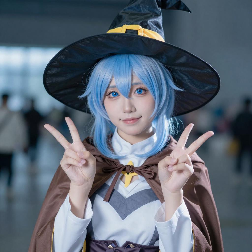 Photograph of a person with light blue hair and blue eyes, wearing a black and yellow witch hat, brown cloak, and white and gray outfit. They are smiling and making a double peace sign with both hands. The background has a blue light.