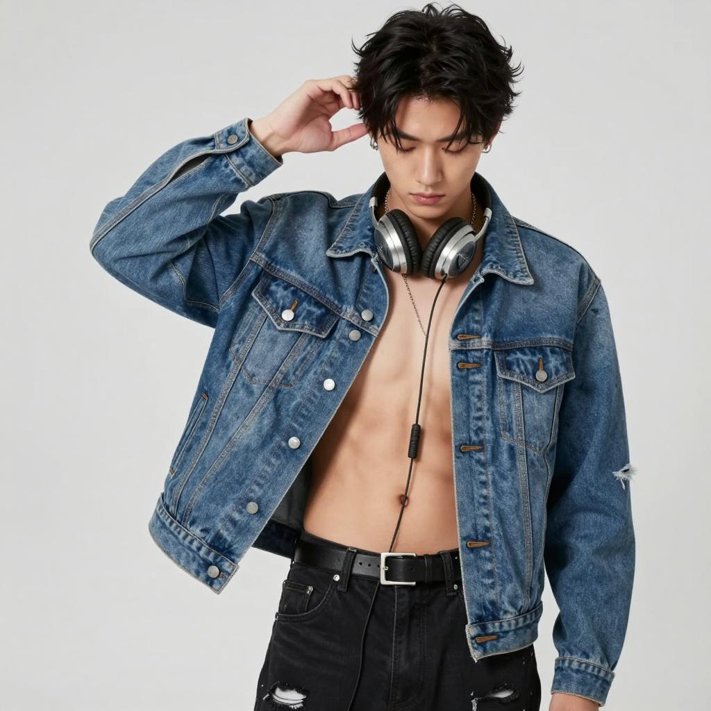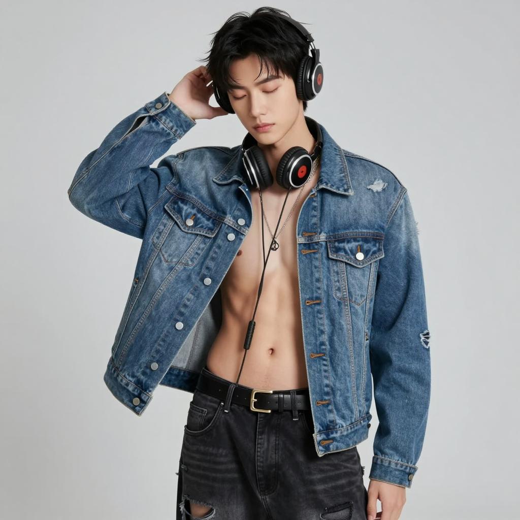 Portrait of a young Asian man with short black hair wearing a faded blue denim jacket open to reveal his bare torso, paired with black ripped jeans and a black belt. He has closed eyes, wears headphones on his head and around his neck, and sports minimal jewelry including a ring and necklace. The background is plain light gray.