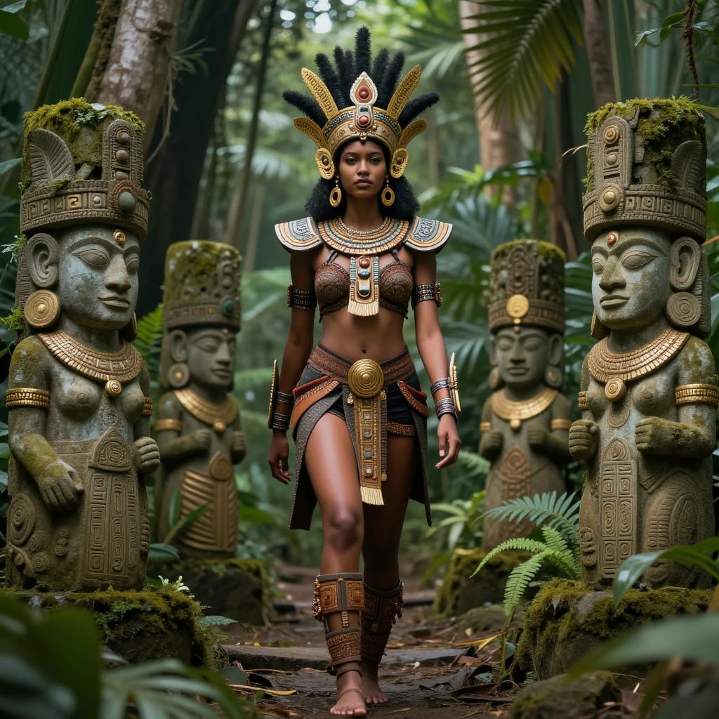 A majestic woman dressed in intricate, tribal-inspired armor stands serenely in a lush, ancient jungle surrounded by stone statues with detailed carvings. The image is rich in green and gold hues and blends fantasy with elements of Afro-futurism and traditional art styles.